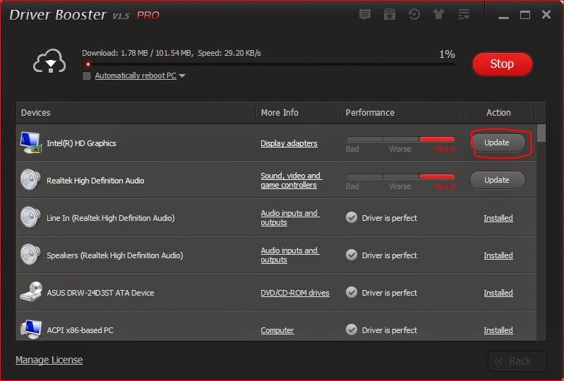 সফটওয়্যারটি ওপেন করার পর নিচের মত উইন্ডো দেখতে পারবেন এই খানে আপনার যে ড্রাইভার টি আপনার সিস্টেম এর সাথে পারফেক্ট না। সেটিতে আপডেট বাটন আসবে। Update বাটন এ ক্লিক করুন। Update বাটন ও ক্লিক করার পর আপনার সফটওয়্যার টি ডাউনলোড পর নিজে নিজে ইন্সটল হয়ে যাবে।