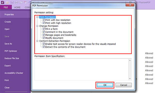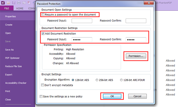 ৪র্থ ধাপঃ এখন নিচের মতো উইন্ডো প্রদর্শিত হবে। আপনি যদি এরকম চান যে আপনার PDF ফাইলটি ওপেন করার সময় পাসওয়ার্ড চাইবে তাহলে প্রথম চেকবক্সে টিকমার্ক দিয়ে একটি পাসওয়ার্ড দিয়ে দিন। আর যদি চান যে আপনার ফাইলটি কপি, পেস্ট, প্রিন্ট বা এডিট রেসট্রিকটেড হউক তাহলে দ্বিতীয় চেকবক্সে টিকমার্ক দিয়ে একটি পাসওয়ার্ড দিন এবং Permission অপশন এ ক্লিক করুন।