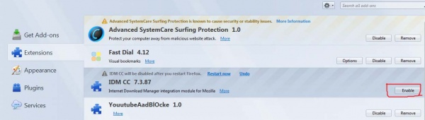 এবার আপনি আইডিএম সি সি এনাবল করে দিন লাল দাগ দিয়ে দেখানো হয়েছে। সর্ব শেষ ফায়ারফক্স রিস্টার্ট করুন। যারা গুগুল ক্রম ইউজ করেন তারা নতুন করে ক্রম ডাউনলোড করা লাগবেনা শুধু এক্সটেনশনে গিয়ে আইডিএম এনাবল করে দিন। ব্যাস কাজ শেষ। এবার ইউটিউব বা ফেজবুবের কোন ভিডিও চালিয়ে দেখুন আর ডাউনলোড করুন আইডিএম দিয়ে ধুমছে। নিচের ছবিটি দেখুন...................................................