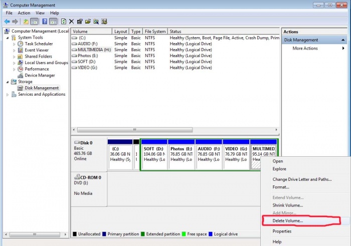 এখানে যা দেখতেছেন তা হলো আপনার কম্পিউটারের সবগুলো ড্রাইভ। ৩। এবার যে ড্রাইভটি ডিলেট করতে চান সেটির উপর রাইট বাটন ক্লিক করে ডিলেট ভলিউমে ক্লিক করুন। আমি আমার মাল্টিমিডিয়া নামক ড্রাইভটি ডিলেট করতে চাচ্ছি, নিচে দেখুন.........................
