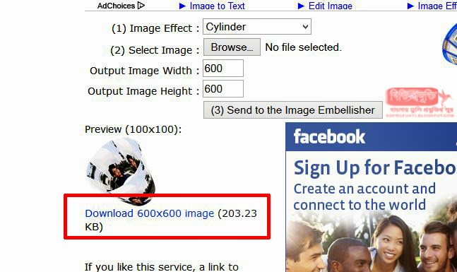 এখান থেকে brows এ ক্লিক করে আপনার ছবি দেখি দিন । তারপর output image width / এবং height এর যায়গায় আপনার প্রয়োজনীয় মাপ টি লিখে দিন , তারপর send to image Embellisher এ ক্লিক করুন ।