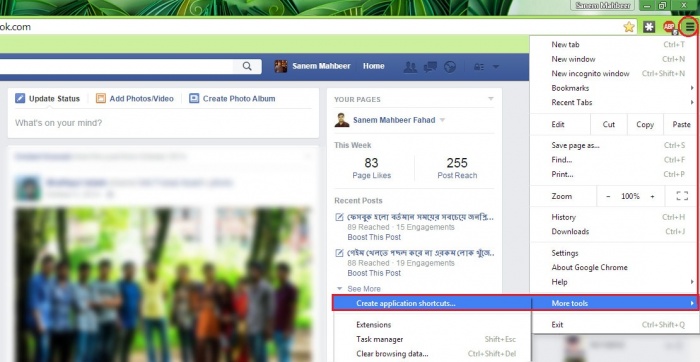 আপনার গুগল ক্রোম ব্রাউজারটিকে এবার ওপেন করুন এবং যে সাইটটিকে ওয়েব অ্যাপ্লিকেশন বানাতে চান সেটাতে প্রবেশ করুন। যেমন আমি ফেসবুকে প্রবেশ করেছি। এবার নিচের চিত্রে দেখানো অপশনে ক্লিক করুন এবং More Tools অপশন থেকে Create Application Shortcuts অপশনে ক্লিক করুন।