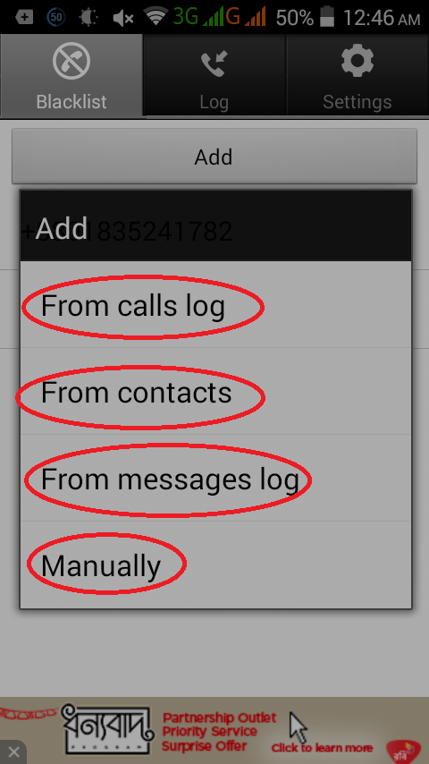 তারপরো না বুজলে আমি বলে দিতেসি প্রথমে add এ ক্লিক করবেন।তারপর আপনি যদি call log/history থেকে নাম্বার এড করতে চান তা হলে from call log এ ক্লিক করেন,from contract হল যদি contract নাম্বার থেকে এড করতে চান,from messege log হল যদি মেসেজ থেকে এড করতে চান,সব সেসে manually হল আপনি নিজে যদি নতুন কোন নাম্বার এড করতে চান তা হলে এই option ব্যাবহার করতে পারেন।
