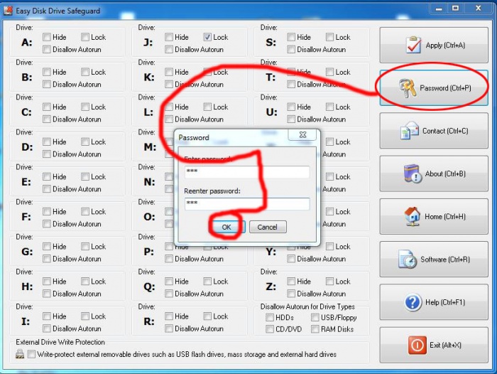 এবার আপনার যে ড্রাইভ/মেমোরী/পেনড্রাইভ লক/হাইড করবেন তা সিলেক্ট করে Password এ ক্লিক করুন। তাহলে পাসোয়ার্ড ঘর আসবে আপনার পাসোয়ার্ড দিয়ে OK ক্লিক করুন।