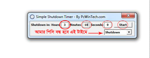 এবার Hours এর ঘরেঃ আপনি আপনার কাঙ্খিত ঘন্টা হিসাব করে বসান, তারপর Minutes, Seconds দিয়ে Start বাটনে ক্লিক করুন।