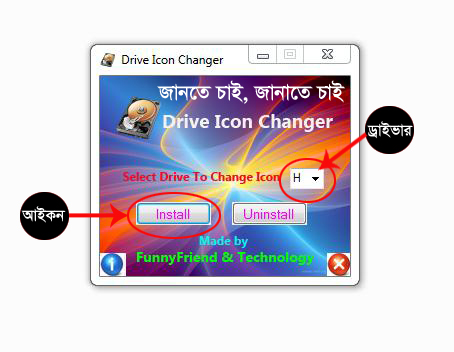 এবার আপনি যে ড্রাইভের আইকন চেঞ্জ করবেন সে ড্রাইভটি সিলেক্ট করুন। তারপর Install বাটনে ক্লিক করে আপনার তৈরি করা / নিচের লিংক থেকে ডাউনলোড করা আইকন টি দেখিয়ে দিন।