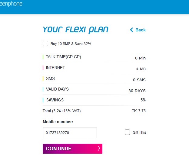 এবার এখান থেকে টক টাইম জিরো এস এম এস জিরো এবং ইন্টারনেট এর যে কোন প্যাক ও validity 30 days সিলেক্ট করুন। এবং buy now এ ক্লীক করুন। এরপর নিচের স্ক্রিন short এর মত আর একটি পেজ দেখতে পাবেন, এখানে মোবাইল নম্বর এর ঘর এ আপনার কাঙ্ক্ষিত মোবাইল নম্বর প্রবেশ করুন এবং কন্টিনিউ বাটনে ক্লিক করুন।