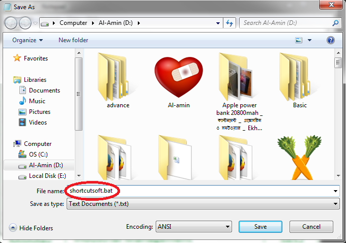 এখন Save করুন আপনার ইচ্ছে মত যে কোন নামে, তবে ফাইলটির এক্সটেনশন অবশ্যই .bat হতে হবে। আমি এখানে File টির নাম দিয়েছি shortcutsoft এবং এক্সটেনশনসহ এর নাম দিয়েছি shortcutsoft.bat