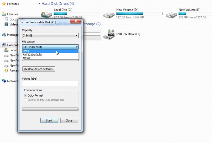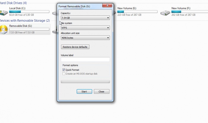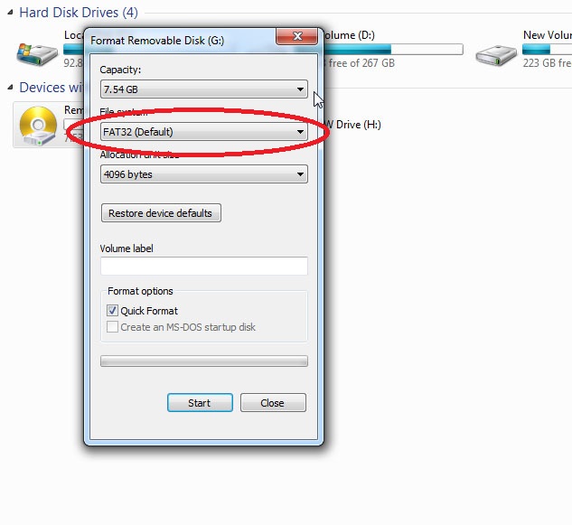 প্রথমে পেনড্রাইভ কে Fat32(Default) থেকে NTFS এ পরিবর্তন করতে হবে। এর জন্য ড্রাইভ এর উপর right click করে format এ ক্লিক করতে হবে। পরে নিচের বক্স টি আসবে।