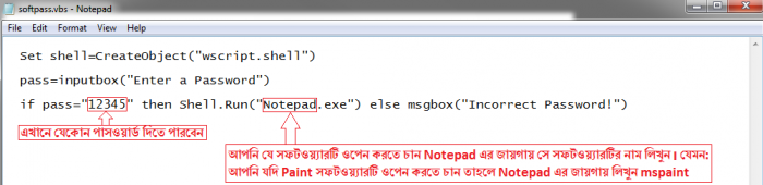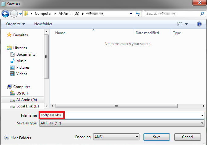 এখন Save করুন আপনার ইচ্ছে মত যে কোন নামে, তবে ফাইলটির এক্সটেনশন অবশ্যই .vbs হতে হবে। আমি এখানে File টির নাম দিয়েছি softpass এবং এক্সটেনশনসহ এর নাম দিয়েছি softpass.vbs