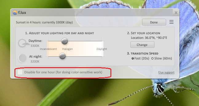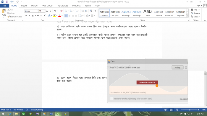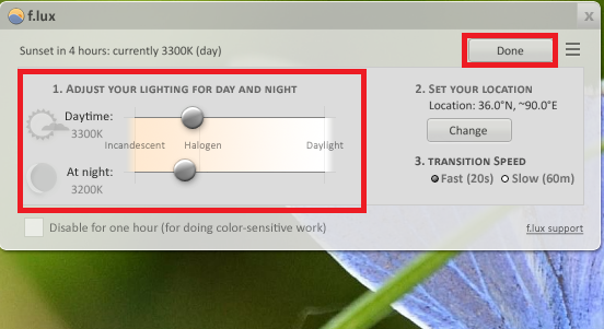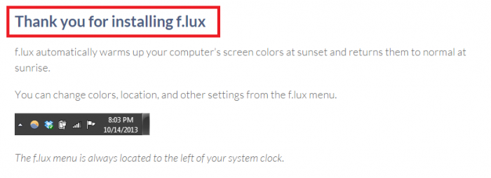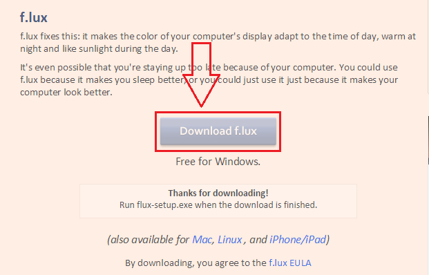১) প্রথমে flux নামক সফটওয়্যারটি এই লিঙ্ক থেকে ডাউনলোড করে নিন। flux সম্পর্কে একটু বলে রাখি। এটি মাত্র ৫৮৩ কেবি. একটি ছোট্ট সফটওয়্যার। যেটা আপনার টোটাল কম্পিউটারের স্ক্রিন সময় মতো বদলে দিবে। যেটা আপনার চোখের জন্য আরাম দায়ক। মনিটরের কালার কম্বিনেশন করার জন্য সবাই ব্যবহার করছেন flux।