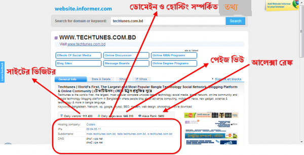 এখানে দেখতে পাচ্ছেন টেকটিউনস এর দৈনিক ভিজিটর, পেজ ভিউ, ও আলেক্সা রেঙ্ক সহ সাইটের DNS।