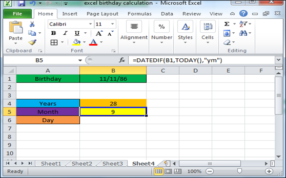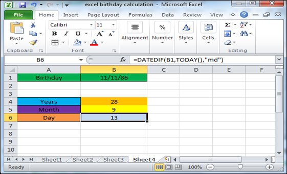 তাহলে আজ আমার বয়স হল ২৮ বছর ৯ মাস। এখন কত দিন সেটা বের করব। এজন্য Day এর পাশের cell এ =DATEDIF(B1,TODAY(),"md") equation টি বসাই। তাহলে আমরা দিন পেয়ে যাব-