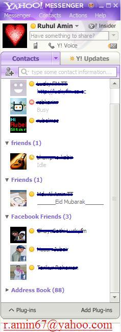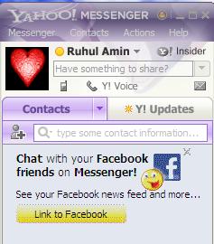 আমারা বিভিন্ন জন বিভিন্ন রকম মেসেঞ্জার ব্যবহার করি। এই সকল মেসেঞ্জারের মধ্যে ইয়াহু মেসেঞ্জার, নিমবাজ, ডিগসবি, পিজিন প্রভৃতি অনেকের কাছেই জনপ্রিয়। মাল্টিপ্রটোকলিক মেসেঞ্জার হিসেবে নিমবাজ, ডিগসবি আর পিজিনই সকলেই ব্যবহার করে থাকে। ইয়াহু মেসেঞ্জার মাল্টিপ্রটোকলিক মেসেঞ্জার নয়। এটি দিয়ে কেবলমাত্র ইয়াহুতে চ্যাট করা যায়। অনেক আগে আমার একটা ইচ্ছা ছিল ইয়াহু মেসেঞ্জারের এমন একটি প্লাগইন খুঁজে বের করবো যেটি দিয়ে ফেসবুকে চ্যাট করা যাবে। কিন্তু আর সম্ভব হল না। বর্তমানে ইয়াহুর নতুন ভার্শন Yahoo! Messenger 11.0.0.1751 Beta বের হল । এটিতে ফেসবুক প্রটোকল যুক্ত করা হল। আমার খুঁজাখুঁজির অবসান ঘটলো। নতুন ভার্শনটি ডাউনলোড করে সেটআপ দিলাম আর পেয়ে গেলাম Link to Facebook অপশনটি । এখানে প্রবেশ করে সবকিছু ওকে করাতেই লগইন হয়ে গেলাম ফেসবুকে।