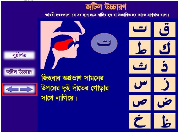 ৬. এখানে আপনি হরফের মাখরাজ দেখতে পারবেন, কোন উচ্চারণ কথার থেকে উচ্চারণ করতে হবে। তারপর --> নেক্সট বাটনে ক্লিক করতে আরও হরফ দেখতে পারবেন।