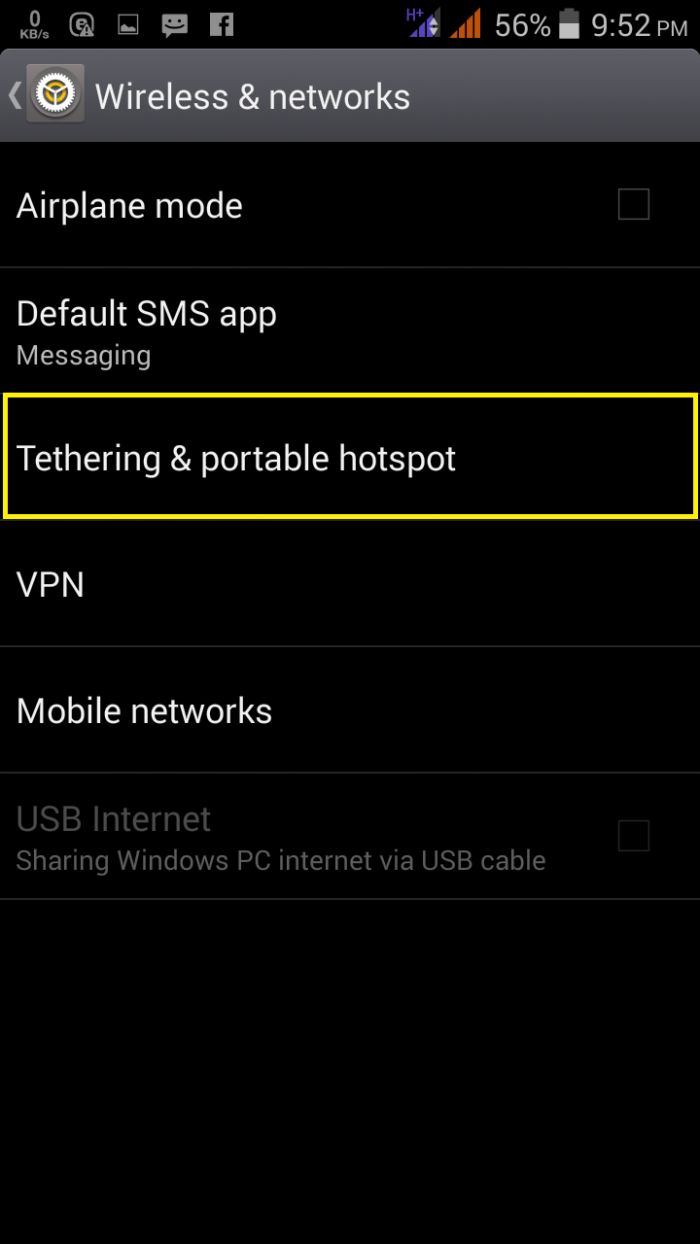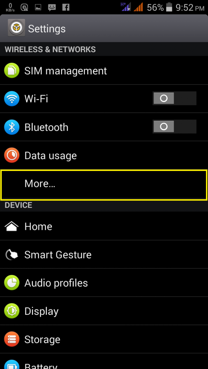 ৩. ওখান থেকে বেরিয়ে আসুন ও আপনার ফোনের সেটিং হতে More এ যান ও সেখান থেকে Tethreing & Portebale Hotspot এ যান। নিচের চিত্র দুটি দেখুন। তাহলে সহজে বুঝতে পারবেন।