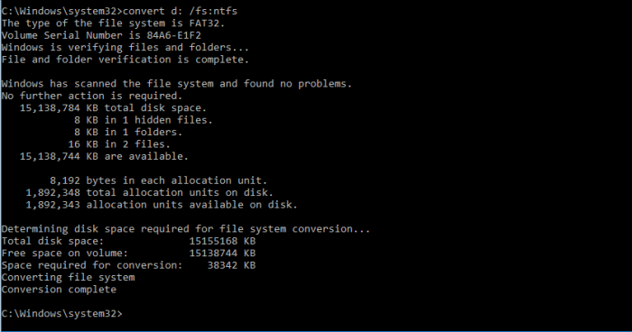 প্রথমে আপনার মেমরি অথবা ফ্লাস ড্রাইভের পাথ কত তা দেখে নিন। যেমন আমার ক্ষেত্রে হয়েছে D এরপর কমান্ড প্রমপট খুলুন লিখুন convert d: /fs:ntfs লিখে দিলে কয়েক সেকেন্ডের মধ্যে নিচের চিত্রে মত দেখতে পাবেন। এর আপনার ড্রাইভের মধ্যে ঢুকে দেখুন সব ফাইলই আছে।