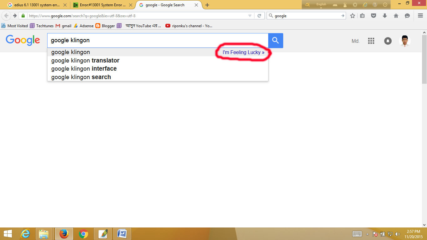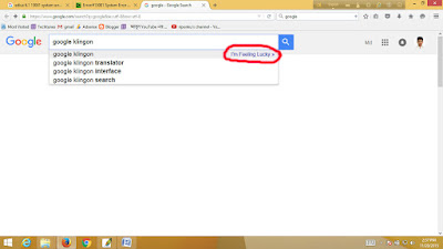 এটা গুগলের “I’m feeling lucky” এর একটি মজার ট্রিক। ট্রিক্সটি দেখতে সার্চ বক্সে টাইপ করুন google klingon এবং দেখবেন নিচে সার্চ সম্পর্কিত অনেক সাজেশন দেখাচ্ছে। আর এই সাজেশন এর ডান পাশেই ‘I am feeling lucky’ অপশন দেখতে পাবেন। এবার ‘I am feeling lucky’ এ ক্লিক করুন।