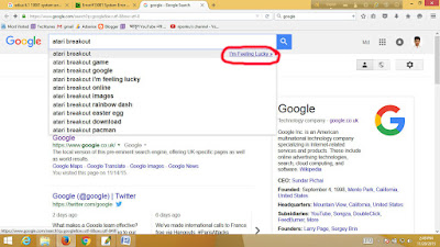 এটা গুগলের “I’m feeling lucky” এর একটি মজার ট্রিক যা মুলত একটি গেম। ট্রিক্সটি দেখতে সার্চ বক্সে টাইপ করুন atari breakout এবং দেখবেন নিচে সার্চ সম্পর্কিত অনেক সাজেশন দেখাচ্ছে। আর এই সাজেশন এর ডান পাশেই ‘I am feeling lucky’ অপশন দেখতে পাবেন। এবার ‘I am feeling lucky’ এ ক্লিক করুন।