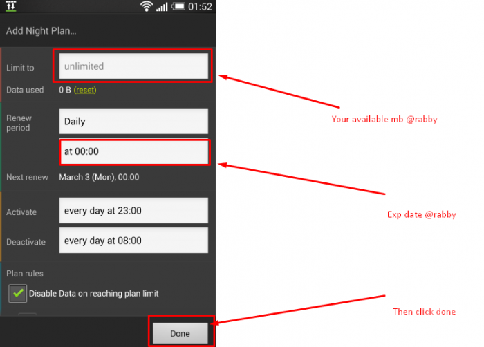 তারপর Limit To (যেখানে Unlimited লেখা) তে আপনার কত এমবি আছে সেটা দিন। এবার renew preiod এ টাইম দিন যেমন ১২ টা।