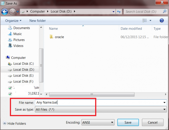 এবার সরাসরি সেভ না করে Save As করুন, Save as Type =all (*.*) ও যেকোন নাম দিয়ে শেষের .txt এক্সটেনশন চেংজ করে দিয়ে .bat লিখুন Ex. Any Name.bat। অর্থাৎ এটাকে ব্যাচ ফাইল হিসেবে সেভ করুন।