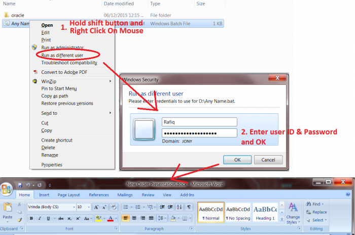 এবার শিফট বাটন চেপে ধরে Any Name.bat এর উপর মাউসের রাইট বাটন ক্লিক করলে Run as different user নামে নতুন একটি অপশন পাবেন। এটাতে গিয়ে ইউজার নেম বা UserName@Domain বা Domain\UserName আর পাসওয়ার্ড দিয়ে ওকে করলে ফাইলটি ওপেন হবে।