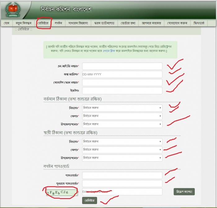 আপনি যদি জাতীয় পরিচয় নিবন্ধন করে থাকেন, জাতীয় পরিচয়পত্র সংক্রান্ত অনলাইন সেবাসমূহ পেতে নিচে রেজিষ্ট্রেশন করুন। যদি এখনও নিবন্ধন না করে থাকেন তবে এখানে ক্লিক করে অনলাইনে নিবন্ধনের জন্য আবেদন করুন।]