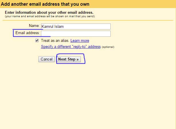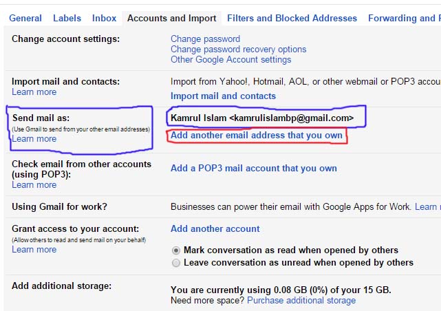 এখানে send mail as: সমান যে kamrulislambp নামে যে এড্রেসটি দেখেতেছেন তা হলো আমি যে একাউন্টে লগইন করে আছি সেটা। এবার আপনি লাল দাগ দেওয়া Add another email address that you own এ ক্লিক করুন তাহলে নিচের মত দেখবেন।