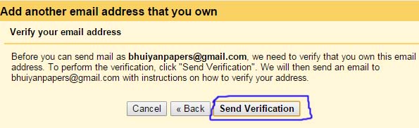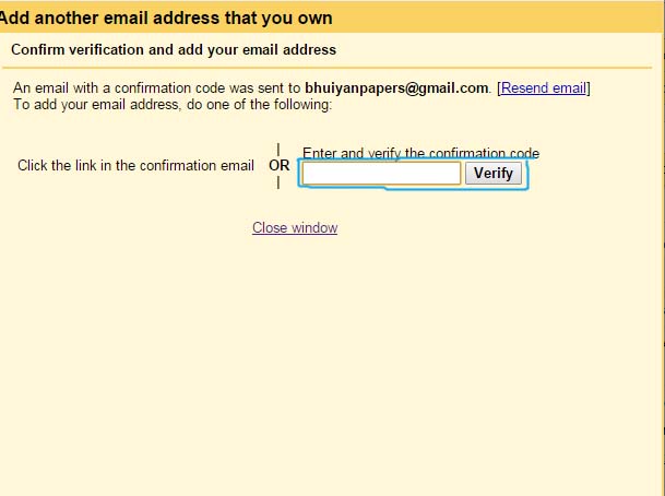 এখন যে এড্রেসটি টাইপ করছিলেন সে এড্রেসে একটি ভেরিফিকেশন কোড যাবে। তারপর ঐ একাউন্ট থেকে কোডটি কপি করে এখানে পেষ্ট করে Verify করে ফেলুন। ব্যাস আপনার কাজ শেষ। এবার আপনি আপনার একাউন্ট থেকে কাউকে মেইল করে দেখুন। যখন recipients একাউন্ট টাইপ করতে যাবেন তখনি দেখবেন এই মাত্র এড করা আপনার একাউন্টটি নিচে শো করছে।