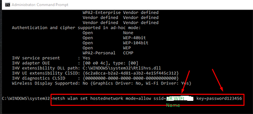 netsh wlan set hostednetwork mode=allow ssid=ssidname key=wifipassword (Just Like নিচের স্ক্রীনশট এর মত)![]()