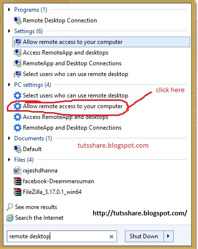 আপনি যে কম্পিউটার এক্সেস করতে চাচ্ছেন সেটার আই পি (যেমন ধরুন ১৯২.১৬৮.১.৪ এটা একটা আই পি) এবং ইউজার(যেমন Administrator) নেম ও পাসওয়ার্ড(যেমন 1234) টা জানতে হবে। এবং রিমুট কন্টোল টা চালু করে রাখতে হবে উইন্ডোজ থেকে ঠিক এভাবে স্টার্ট বাটন ক্লিক করে নিচের সার্চ বারে লিখুন Remote desktop..