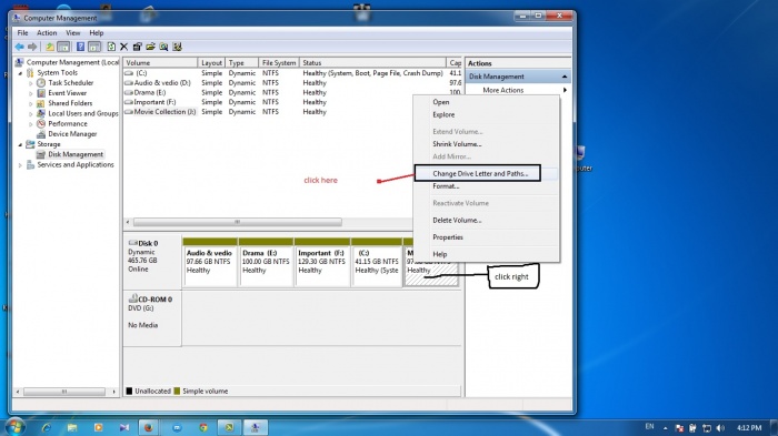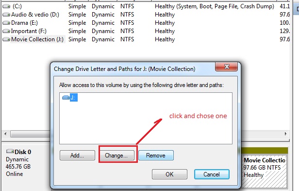 ড্রাইভ লেটার চেঞ্জঃ ড্রাইভ লেটার চেঞ্জ এর জন্য যে ড্রাইভ এর লেটার চেঞ্জ করতে চাই সেই ড্রাইভের উপর কার্সর রেখে Right button ক্লিক করি উপরের চিত্রের ন্যায়।change drive letter and path এ ক্লিক করে নিচের মত উয়িন্ডো আসবে সেখান থেকে change এ ক্লিক করে নিউ ড্রাইভ যেমন K, H, S ইত্যাদি সিলেক্ট করে ok প্রেস করি ব্যাস ড্রাইভ চেঞ্জ হয়ে গেল। এক্ষেত্রে যে লেটার দিবেন সেটা আগে কোন ড্রাইভে থাকলে কিন্তু হবে না। অবশ্যই নূতন লেটার হতে হবে।