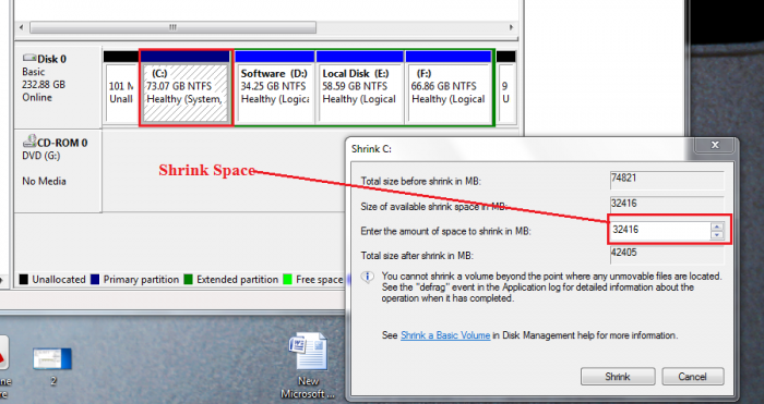 এবার আসি কিভাবে আগের করা কোন ড্রাইভ পার্টিশন করবেন, যে ড্রাইভ কে পার্টিশন করতে চান তার উপর কার্সর রেখে right botton ক্লিক করে সেলেক্ট করুন Shrink Volume। ক্লিক করার পর নিচের মত একটা উইন্ডো আসবে যেখানে কত সাইজ মধ্যে নিউ ড্রাইভ করতে পারবেন সেটা দেখাবে। সেখান থেকে আপনার মত সাইজ সিলেক্ট করে shrink বাটন ক্লিক করলেই নিঊ একটা ড্রাইভ হয়ে হাবে। এবার my computer গিয়ে নিউ ড্রাইভ টাকে একটা ফরম্যাট দিতে হবে।