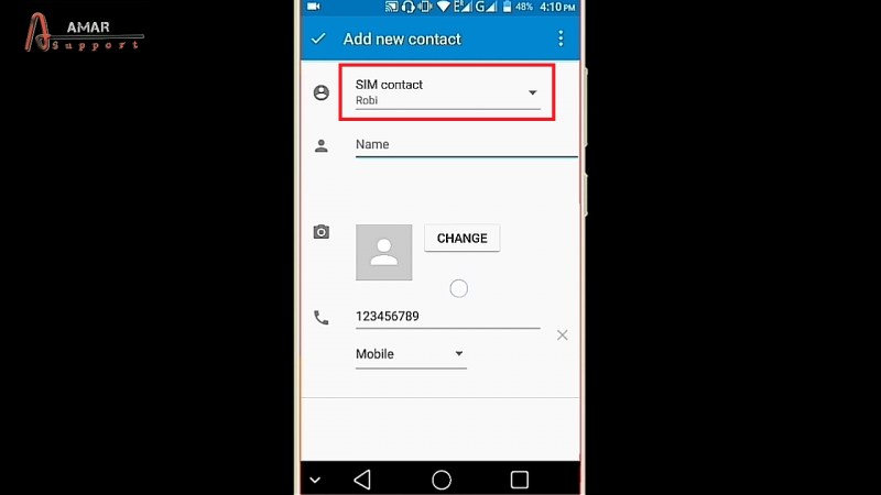 আমরা সাভাবিক নতুন কোন নাম্বার শেভ করার জন্য গেলে উপরের মত পেইজটি আসে। এখানে দেখুন উপরে লেখা রয়েছে SIM Contact, SIM Contact লেখাটির উপরে ক্লিক বা টাস করলে নিচের মত একটি পেইজ পাবেন।