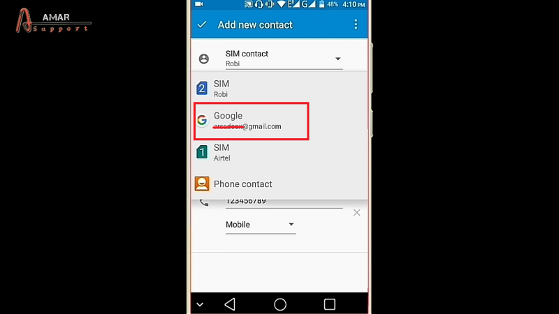 এখানে আমার মোবাইলে যেই জিমেইলটি লগইন করা আছে সেটি দেখাচ্ছে। আপনাদের মোবাইলে যদি কোন জিমেইল একাউন্ট লগইন করা থাকে তাহলে এইভাবে দেখতে পাবেন। এখান থেকে আপনার জিমেইটিতে ক্লিক করুন এবং নাম্বারটি সেভ করুন। এভাবে শুধু নাম্বার সেভ করার সময় সীম বা ফোন সিলেক্ট না করে আপনারা আপনাদের জিমেইলটি সিলেক্ট করে দিবেন।