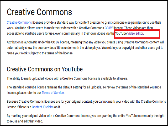 কিন্তু কেও যদি ক্রিয়েটিভ কমন্স লাইসেন্স এর আন্ডারে কোন ভিডিও পাবলিশ করে তাহলে অন্য কেও এই ভিডিও রিইউস করতে পারবে। অর্থাৎ এই ভিডিওটি অন্য কেও এডিট অথবা মডিফাই করে পুনরায় ইউটিউবে পাবলিশ করতে পারবে। এবং এই ক্রিয়েটিভ কমন্স লাইসেন্স এর ভিডিও এডিটিং এর জন্য তাকে অবশ্যই ইউটিউবের ডিফল্ট ভিডিও এডিটর ব্যবহার করতে হত।
