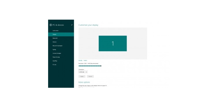 আপনার স্ক্রিন রেজুলেশন এবং অন্যান্য সেটিংস কন্ট্রোল প্যানেল ছাড়াও সরাসরি স্টার্ট স্ক্রিন থেকে চেঞ্জ করা যাবে। চার্মস বার থেকে settings এ গিয়ে change pc settings এ যান।এরপর Display তে ক্লিক করে ডিস্প্লে রেজুলেশন বা অন্যান্য সেটিং পরিবর্তন করুন।