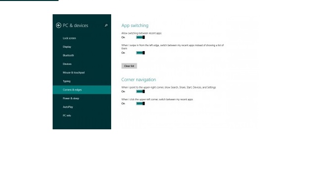 উইন্ডোজ ৮ এ hot corner ডিজেবল করার জন্য থার্ড পার্টি টুল বা রেজিস্ট্রি হ্যাক ব্যবহার করতে হত। কিন্তু উইন্ডোজ ৮.১ এ এটা খুব সহযেই pc and device সেটিং অন করে Corner and Edges section থেকে corner navigation off করা যায়।