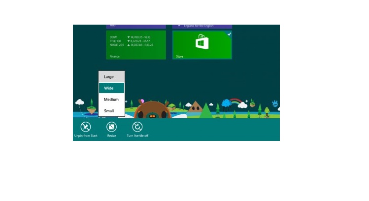 আপনি শুধু হেডলাইনের বা এপ্স টাইটেলের লেখার সাইজ নয় আপনি এই উইন্ডোজে এপের যে আইকন বা টাইল আছে সেটিও ছোট বড় করতে পারবেন। এটা করার জন্য STart screen এ গিয়ে যেকোনো এপের Tile এর উপর গিয়ে মাউসের রাইট বাটন ক্লিক করুন এরপর নিচের মেনু থেকে চিত্রের মত large,wide, medium অথবা Small সিলেক্ট করুন।