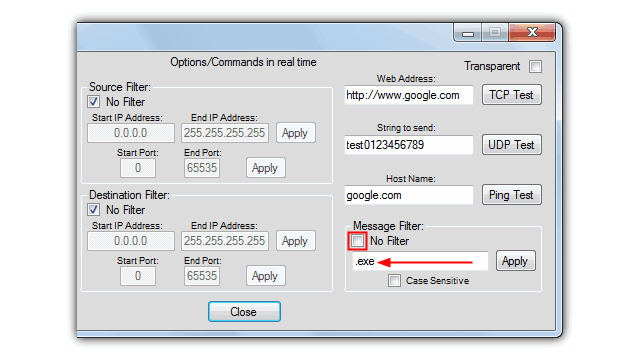 ১। টুলসটি চালু করে অপশনসে চলে যান। উপরের ছবির মতো Message Filter > No Filter অপশনটির টিক চিহ্ন উঠিয়ে দিন। এবার টেক্স বক্সে.exe লিখে এপ্লাই বাটনে ক্লিক করে উইন্ডোটি বন্ধ করে দিন।