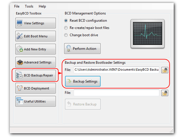 EasyBCD সফটওয়্যারটি চালু করুন। তারপর BCD Backup/Repair বক্সে ক্লিক করুন। ব্যাকআপ লোকেশন নির্বাচন করে Backup Settings এ ক্লিক করলে বাকি সব অপশন পেয়ে যাবেন।
