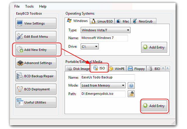 ১। EasyBCD সফটওয়্যারে বাম দিকের অপশনগুলোথেকে Add New Entry বাটনে ক্লিক করুন।