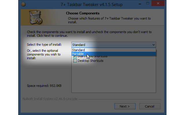 এখানে Select the type of install ড্রপডাউন বক্স থেকে আপনি পোর্টেবল সংস্করণটিও বেছে নিতে পারবেন। পোর্টেবল সংস্করণটি আপনার পছন্দসই ফোল্ডারে ইন্সটল হবে। তবে যেহেতু এটি টাস্কবার কাস্টমাইজেশন এপপ, সেহেতু এটার নরমাল সংস্করণই ইন্সটল দেওয়া উত্তম।