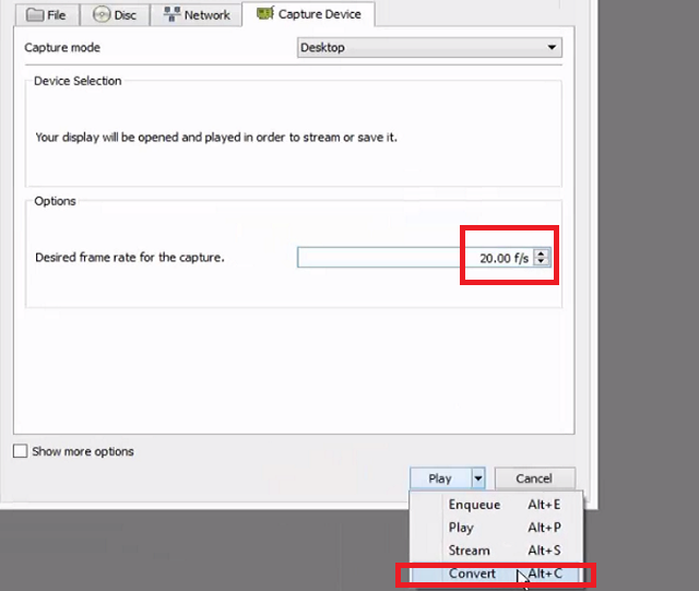 তারপর “Frame Rate” দিবেন 20 এবং একদম নিচে ড্রপডাউন মেনু থেকে সিলেক্ট করে দিবেন “Convert” কে।