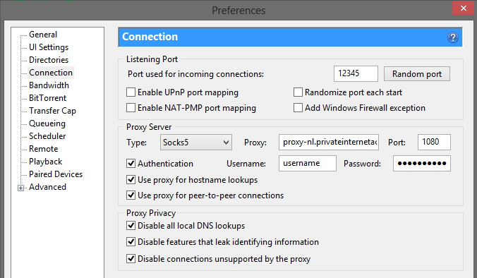এরপর uTorrent ওপেন করুন। Options > Preferences > Connection এ গিয়ে Proxy Server এর নিচে Type এ Socks5 সিলেক্ট করুন। আর নিচের মত করে ঘরগুলো পূরন করুন।