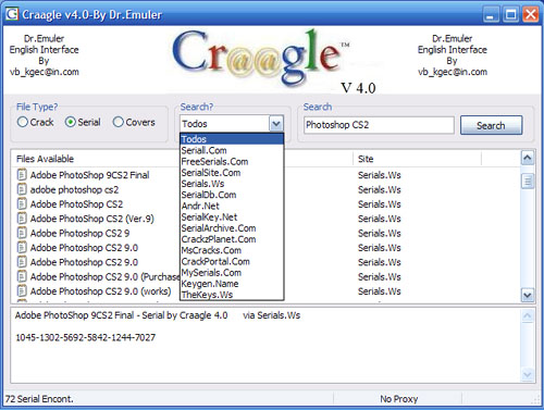 এটি একটি ফ্রি টুলস যা দ্বারা আপনি নেট থেকে খুব সহজে সিরিয়াল কী / ক্র্যাক নামিয়ে নিতে পারবেন। এই সফটওয়্যার’টি মুলত জনপ্রিয় সব সিরিয়াল কী সাইট থেকে সিরিয়াল কী / ক্র্যাক খুজে দেবে আপনাকে। প্রথমে ছোট্ট এই সফটওয়্যার’টি নিচের লিঙ্ক থেকে নামিয়ে নিন তারপর সার্চ অপশনে আপনার সফটওয়্যার নাম এবং ভার্শন দিয়ে সার্চ করুন । সার্চ দেবার পর কিছুক্ষন অপেক্ষা করুন তারপর পর আপনার কাঙ্খিত সফটওয়্যার সিরিয়াল বা ক্র্যাক। এটি ব্যাবহার করার সময় আপনার কম্পিউটারের এন্টিভাইরাস বন্ধ করে রাখবেন আর না হয় এটি’কে ভাইরাস হিসেবে চিহ্নিত করবে। এটি কম্পিউটারের কোন ক্ষতি করবে না।