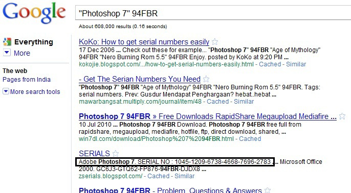 গুগল সার্চে 94FBR কিওয়ার্ডের সাহায্যে খুব সহজেই অনেক প্রয়োজনীয় সফটওয়্যারের সিরিয়াল কী খুজে পাওয়া যায়। প্রথমে গুগল সার্চে প্রবেশ করুন (www.google.com) তারপর যদি আপনি ফটোশপের সিরিয়াল কী খুজতে চান তাহলে সার্চ বক্সে নিচের মত করে সার্চ করুন।গুগল সার্চে 94FBR কিওয়ার্ডের সাহায্যে খুব সহজেই অনেক প্রয়োজনীয় সফটওয়্যারের সিরিয়াল কী খুজে পাওয়া যায়। প্রথমে গুগল সার্চে প্রবেশ করুন (www.google.com) তারপর যদি আপনি ফটোশপের সিরিয়াল কী খুজতে চান তাহলে সার্চ বক্সে নিচের মত করে সার্চ করুন।
