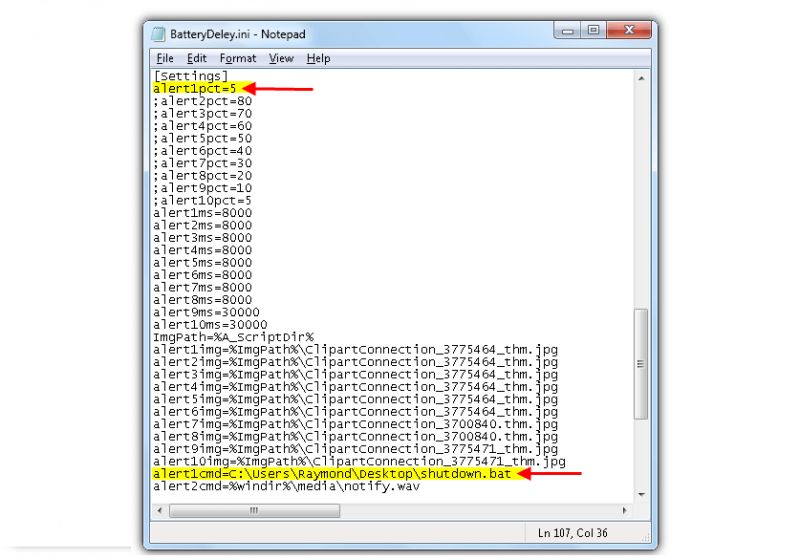 মূলত আপনাকে শুধুমাত্র alertXpct এবং alertXcmd এর ভেলু ইডিট করতে হবে যেখানে pct মানে ব্যাটারির চার্জের পারসেন্টেজ এবং cmd হচ্চে হচ্চে আপনার কাস্টম প্রোগ্রামটি কোথা থেকে রান হবে তার লোকেশন বা প্যাথ। নিচের স্ক্রিনশট এ দেখুন ব্যাটারি লেভেল ৫% দেয়া হয়েছে আর প্যাথ shutdown.bat দেয়া হয়েছে। বিল্ট ইন ভাবে betterydeley আপনার স্টার্ট আপ উইন্ডোতে অটোমেটিক অন হবে না। তাই অবশ্যই একটি শর্টকার্ট তৈরি করে ঐটা স্টার্টআপ ফোল্ডারে ড্রপ করুন;
