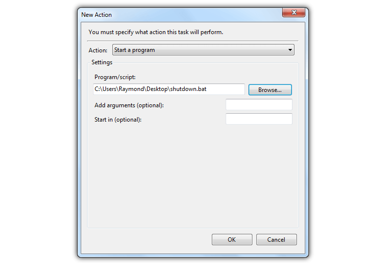 এখন Action tab এ যান এবং new বাটনে ক্লিক করুন। এরপর একটা ড্রপ ডাউন মেনু পাবেন action এ। সেখানে action এ নিচের ছবির মত start the program রাখুন আর ব্যাচ ফাইল এর লোকেশন দেখিয়ে দিন যেটা ব্যাটারি লো হলে রান করাতে চান। এরপর কন্ডিশন ট্যাব এ যান আর start the task only if computer is on AC এখান থেকে টিক টা উঠিয়ে দিন এবং Ok তে ক্লিক করুন।