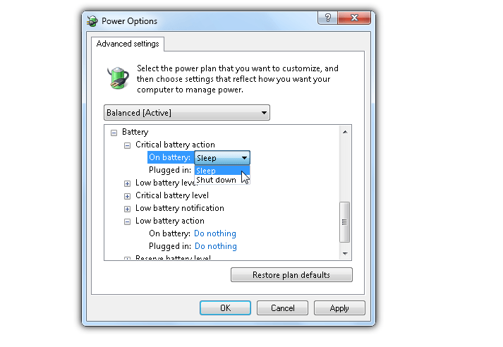 control pannel>> Hardware and Sound>> power options এ যান। "change plan settings এ ক্লিক করুন এবং পরে advanced power settings এ ক্লিক করুন। এরপর Expand Battery>> critical battery action Or Low battery action এ গিয়ে sleep সিলেক্ট করতে হবে। ডিফল্টভাবে লো ব্যাটারি একশন ১০% আর ক্রিটিক্যাল ৫% এ হয়ে থাকে কিন্তু এডভান্সড সেটিং এ গিয়ে আপনি এটাও চেঞ্জ করতে পারবেন।